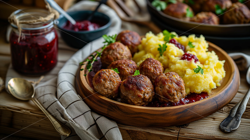 Swedish meatballs arranged on a rustic wooden board with lingonberry sauce and mashed potatoes.