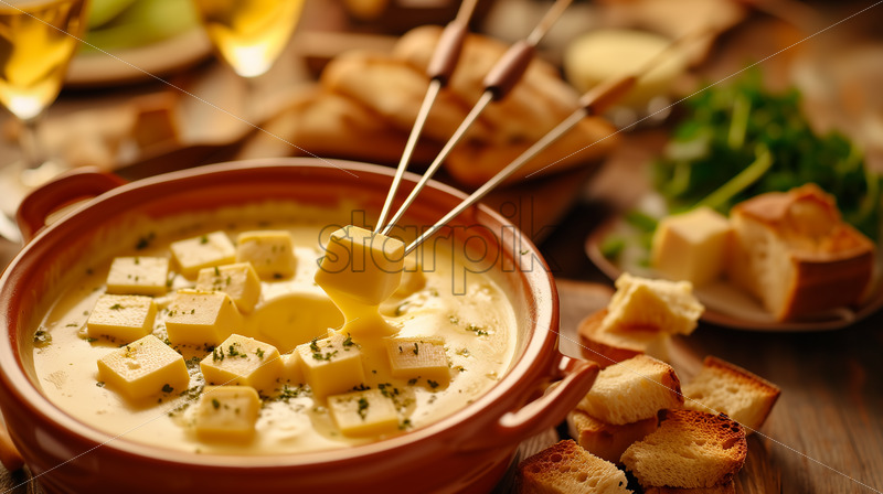 Swiss Cheese Fondue, a communal dish of melted cheese served in a traditional fondue pot.