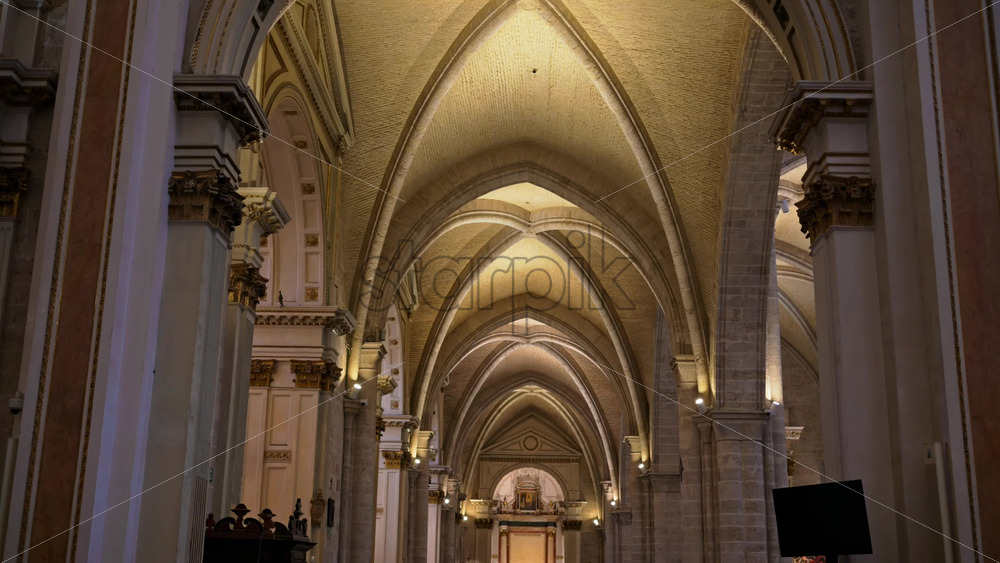 Symmetrical interior view down a Gothic nave with ribbed vaults and ornate columns in the Valencia Cathedral, Spain Royalty Free Stock Video Footage