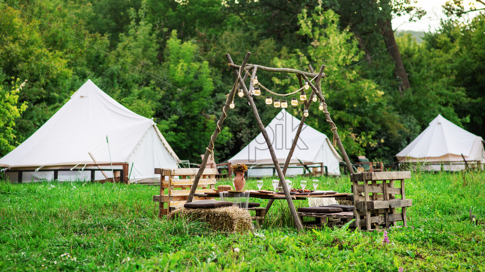 Table with food and drinks at glamping, Greenery around, tents on the background