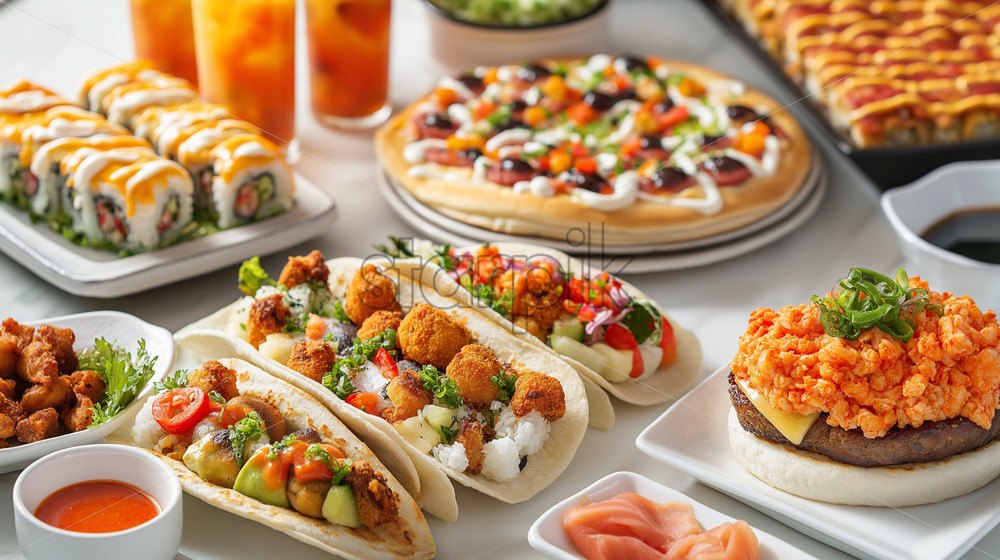 delicious tacos with sushi and global street food: bao buns, kebabs, sliders, and loaded with chips