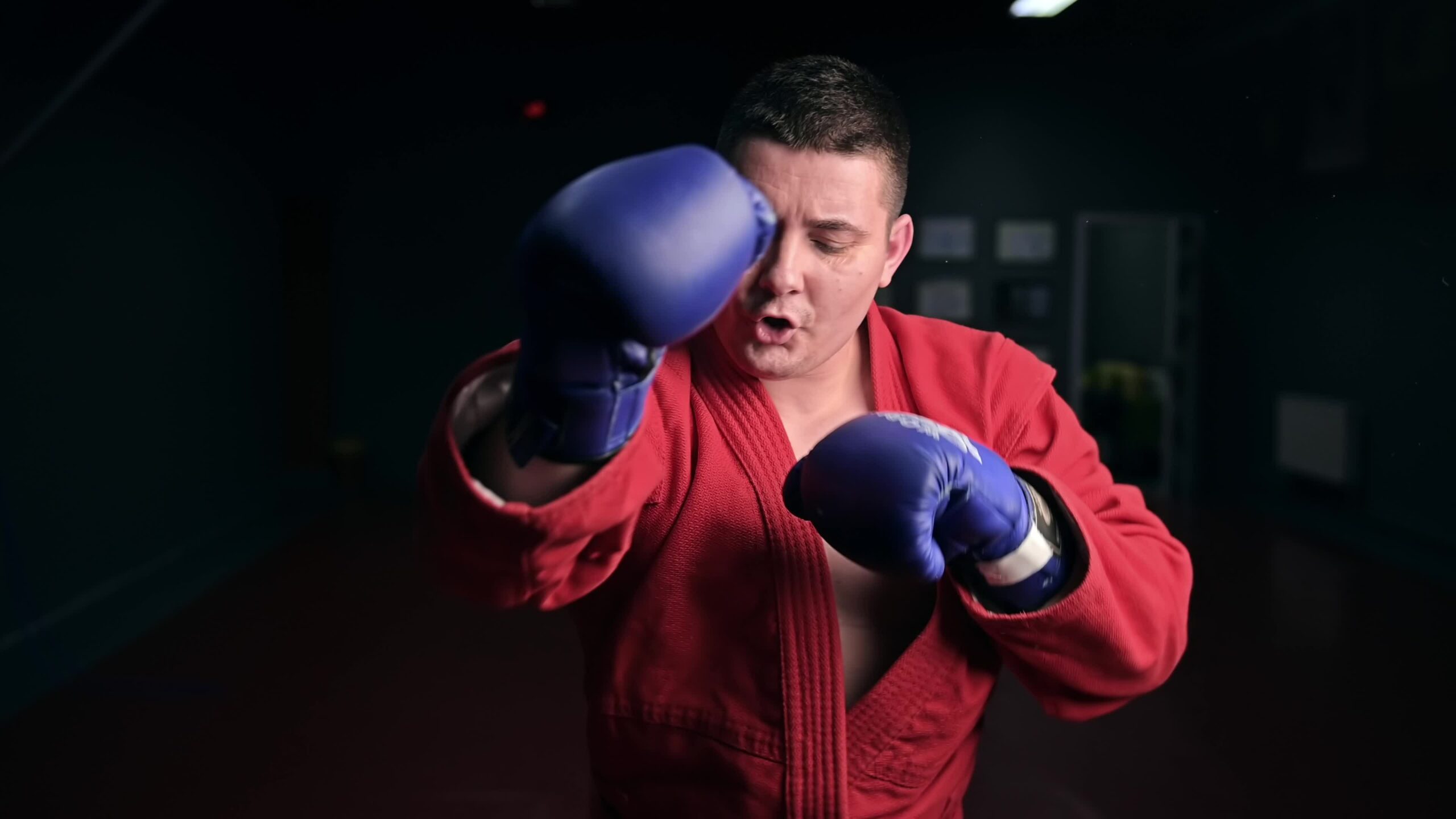 Taekwondo in red kimono boxing. Taekwondo practitioner in a red kimono and gloves is boxing in front of him in a gym in Chisinau, Moldova. Royalty Free Stock Video Footage