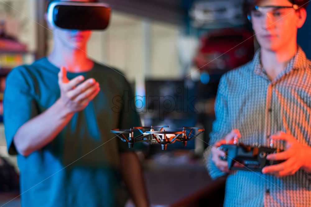 Home » Shop » photo » Teens doing experiments in robotics in a laboratory. Boy in protective glasses and guy in VR headset controlling a flying drone using controller and hand. Red and blue illumination