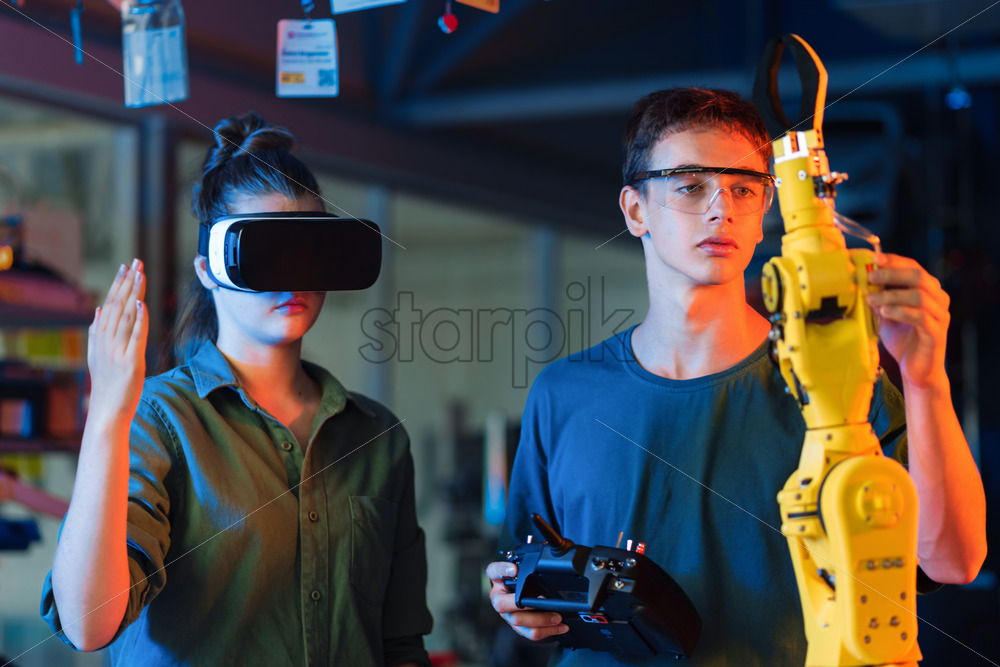 Teens doing experiments in robotics in a laboratory. Boy in protective glasses touching at a robot controlled by a girl hand. Red and blue illumination