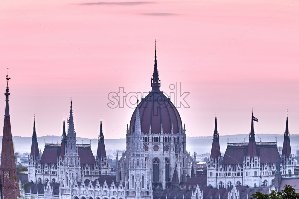 Cruise ships at sunset on Danube river. Warm sky reflecting on water. Famous parliament and city on background. Budapest, Hungary Royalty Free Stock photo