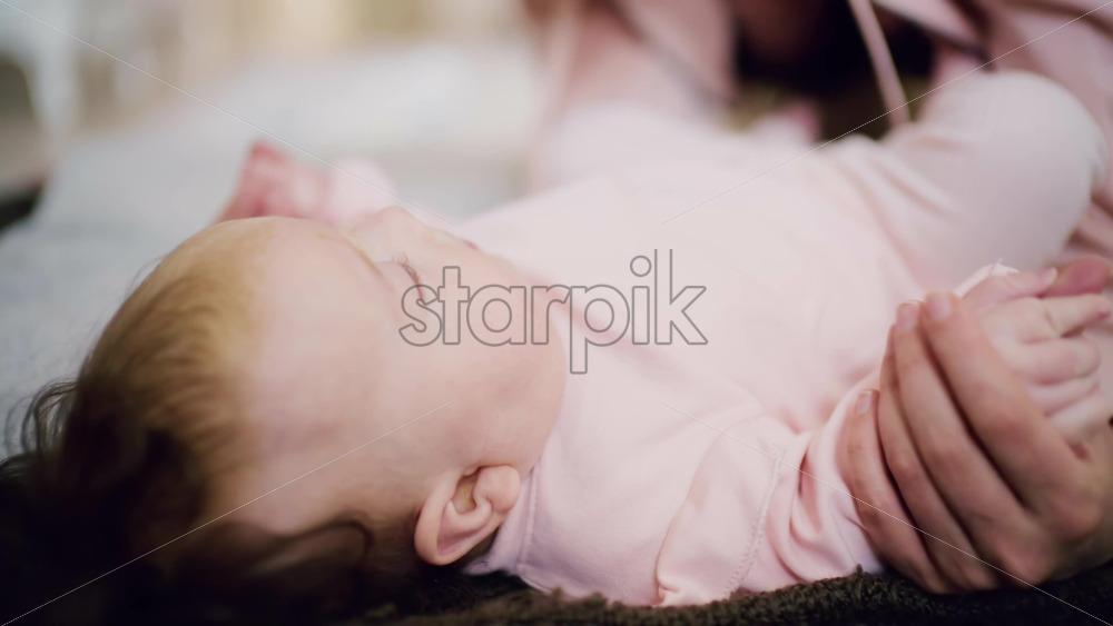 Mother gently wrapping a baby in a soft blanket during a massage and care session