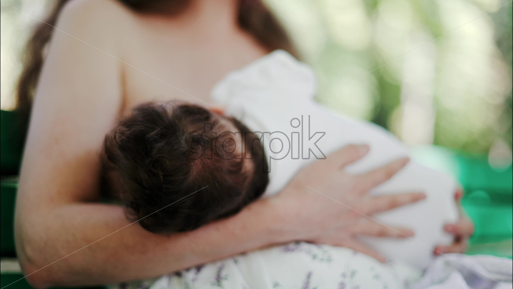 A mother with long wavy hair siting on a bench, breastfeeding her baby in a peaceful park, next to a modern baby stroller Royalty Free Stock Video Footage
