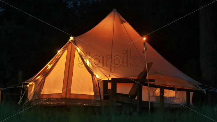 Video – Tent with burning torches, lamps and wooden chairs at glamping, forest around, night