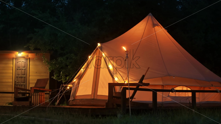 Tent with burning torches, lamps and wooden chairs at glamping, forest around, night Royalty Free Stock Video Footage