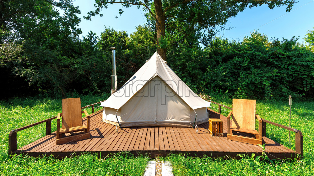 Tent with wooden chairs in front of it at glamping. Nature, greenery around