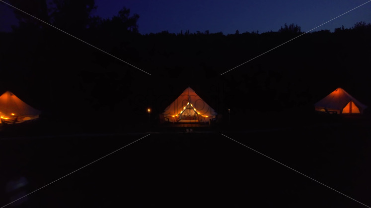 Tents with wooden chairs at glamping, lush forest around Royalty Free Stock Video Footage