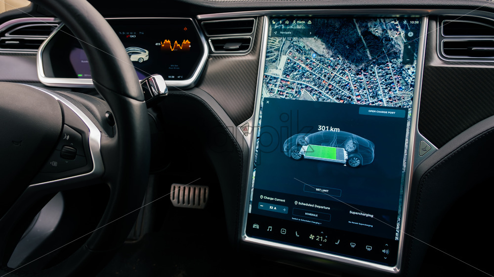 CHISINAU, MOLDOVA – JANUARY, 2022: Tesla Model S P90 interior. Display showing map and information about charging
