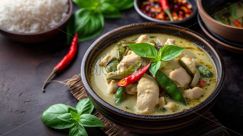 A tantalizing photograph showcasing Thai Green Curry, a fragrant and spicy coconut curry with chicken.