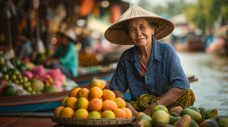 Immerse yourself in the vibrant energy of a traditional Thai floating market with this dynamic photograph featuring a full-body shot of an elderly female vendor surrounded by colorful fruits. The lively scene, set against vibrant boats, is bathed in soft natural light with a touch of warmth, capturing both the hustle and bustle and the warm ambiance of the market. The traditional Thai hat and abundance of local produce further showcase the richness of Thai culture.