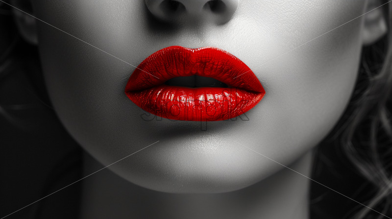 The black and white portrait of a girl, the lips accentuated in red