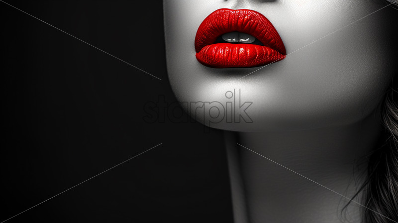 The black and white portrait of a girl, the lips accentuated in red