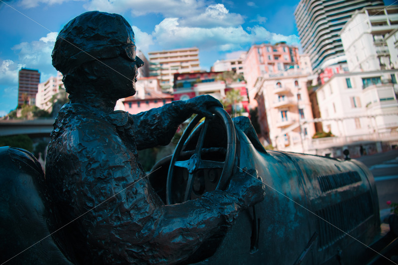 Monte Carlo, Monaco – March 8, 2024 : The bronze statue of William Grover-Williams, driving a Bugatti