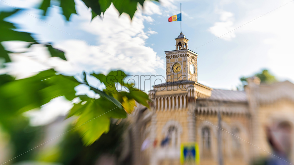 Municipality hall mayor building, city council, Chisinau, Moldova, sunny day blue sky, stefan cel mare main street, old musical clock, watchtower townhouse