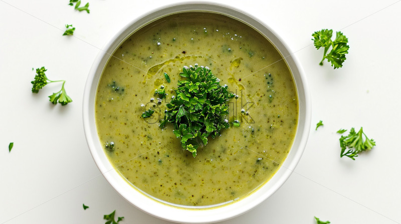 The creamy broccoli soup in white bowl, topped with a generous sprinkle of fresh parsley, on white background,