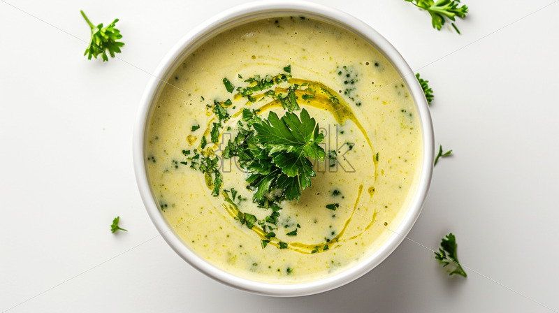 Home » Shop » Uncategorised » The creamy broccoli soup in white bowl, topped with a generous sprinkle of fresh parsley, on white background,