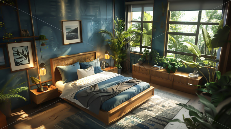 Modern vacation house in a beach side a wooden bedroom with balcony, cozy couch, beach chair and classy bedframe in a rattan theme with indoor plants