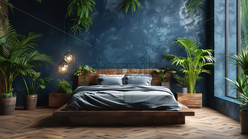 Wooden vacation house in the beach side, clear glass sliding door, balcony, beach chair and a classy bedframe with indoor plants in a wood theme with neat ambience