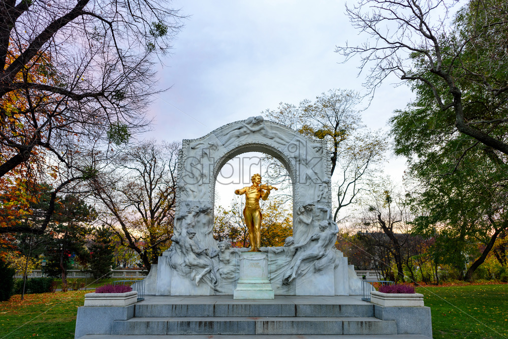 The golden-plated statue of music composer Johann Strauss. Daylight view