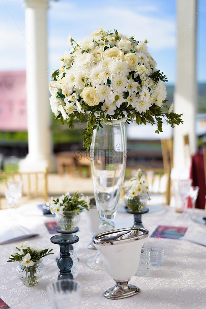 the holiday table decorated with flowers, decorative elements and combined with colors Royalty Free Stock photo