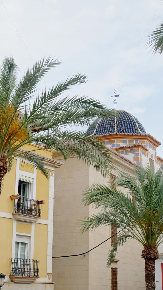 The iconic blue-tiled dome of Iglesia de San Jaime y Santa Ana framed by palm fronds and pastel facades in the Old Town of Benidorm, Costa Blanca, Spain. Vertical Royalty Free Stock Video Footage