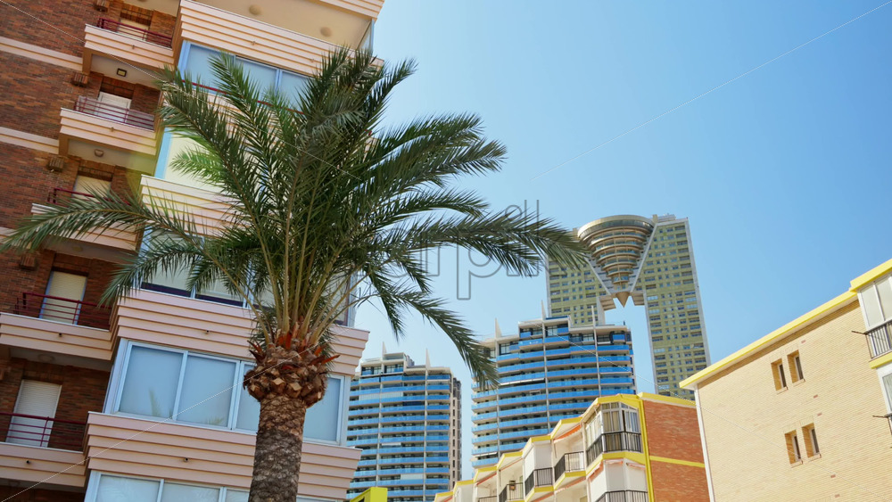 Benidorm, Spain – May 25, 2025: Sun bleached residential blocks with a patchwork of awnings in the Colonia Madrid area Royalty Free Stock Video Footage
