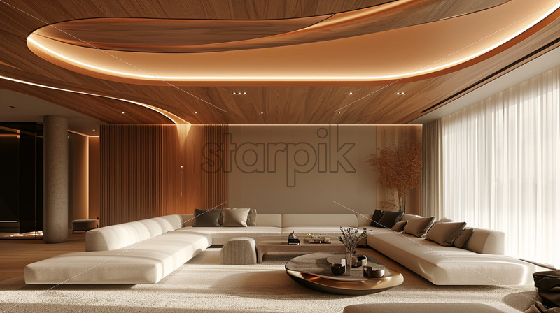 A photograph capturing the expansiveness of a living room, featuring natural lighting, wooden floor, a wooden shelf with plants, a large canvas painting, and large glass panels that offer a view of the concrete paving, grass, and trees outside, creating … Read More
