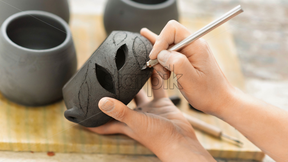 The master of sculpting pottery working in a studio. Cuts holes in fresh pottery