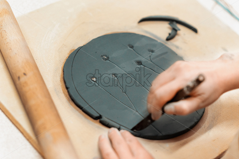 The master of sculpting pottery working in a studio. Forming a circle from smoothed clay. Tools on the table