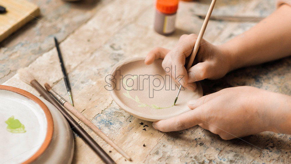 The master of sculpting pottery working in a studio. Painting the bottom of the plate with a brush, tools around