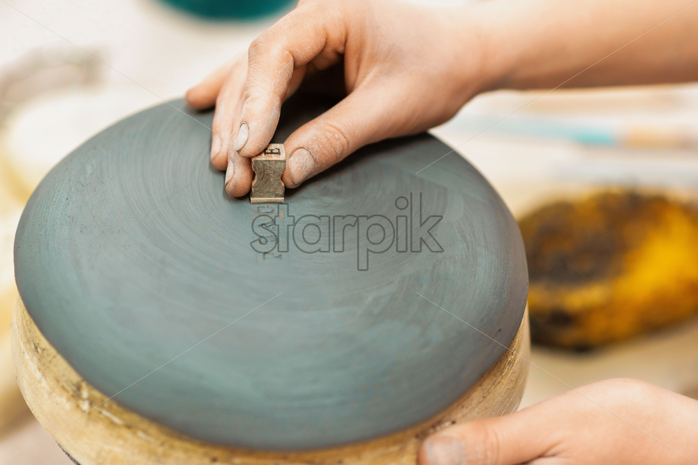 The master of sculpting pottery working in a studio. Stamping an inscription on a clay billet. Tools on the table