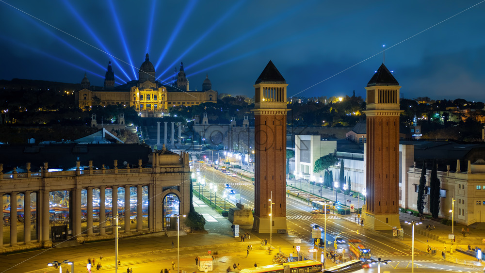 The National Palace and Venetian towers at night, moving cars, nightlights in Barcelona, Spain