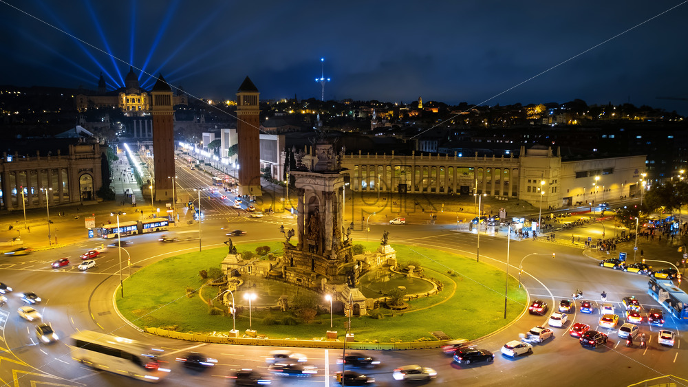 Plaza de Espana, The Venetian Towers, fountain and columns, view from The Palau Nacional in Barcelona, Spain. Night