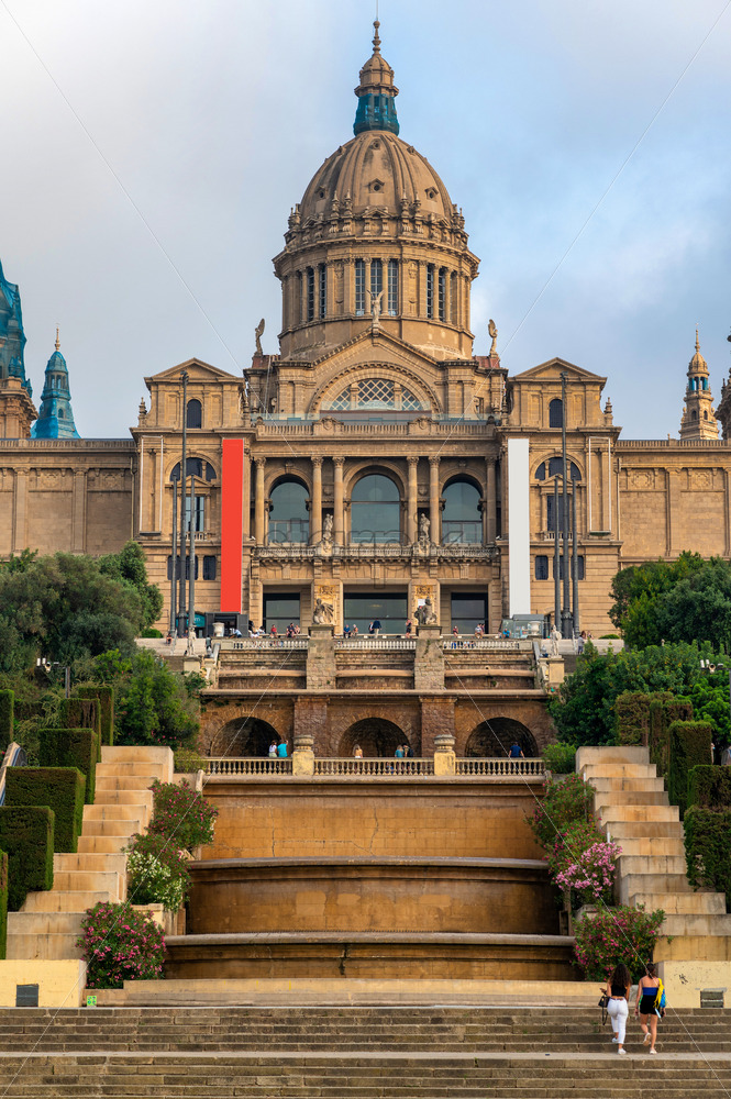 The National Palace, people, gardens and cascade staircase in front of it. Vertical shot, Barcelona, Spain