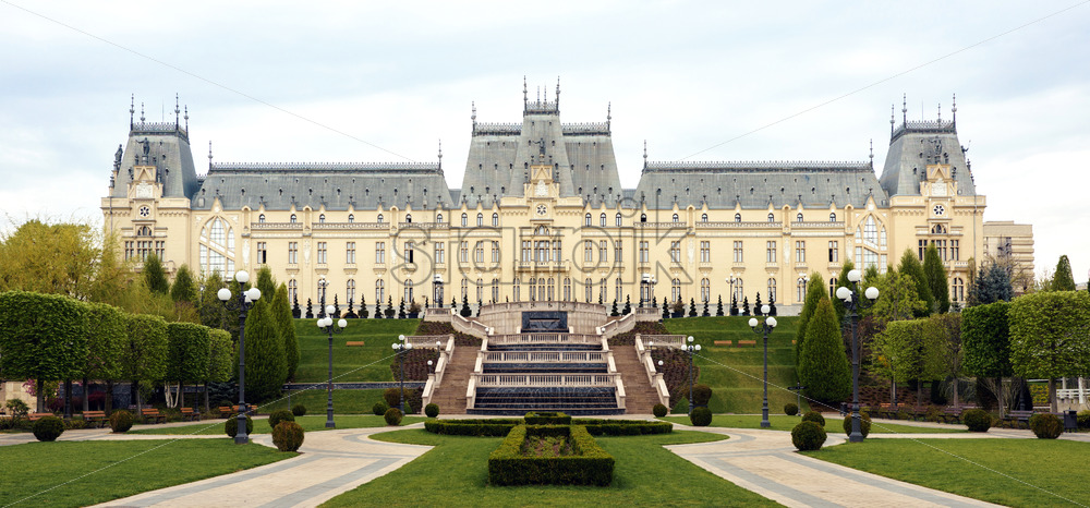 IASI, ROMANIA – AUGUST, 2022: Aerial drone view of the Palace of Culture in downtown at sunset. Square with Stephen the Great statue, people and greenery in front of it