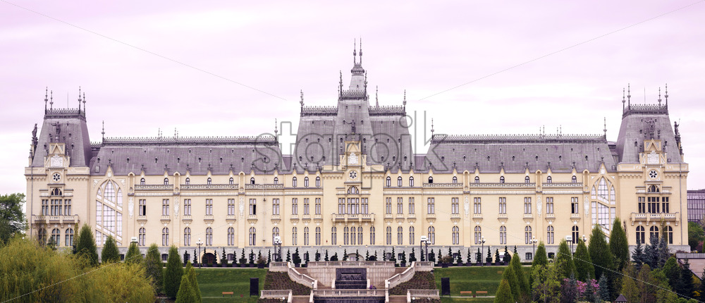 Aerial drone panoramic view of the Palace of Culture in Iasi downtown, Romania. Square with fountains, people and greenery in front of it, multiple buildings around