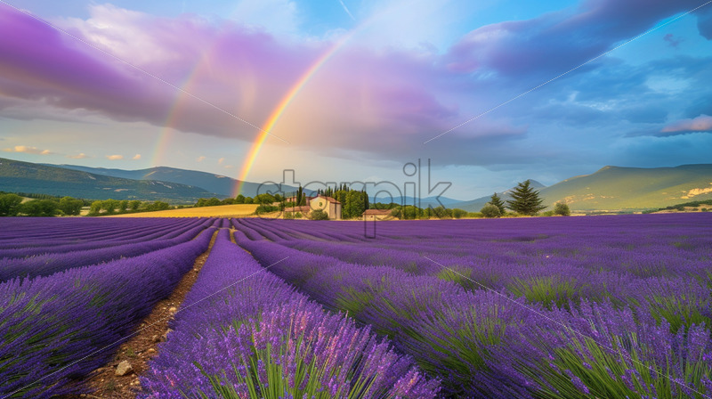The rainbow over a field of lavender