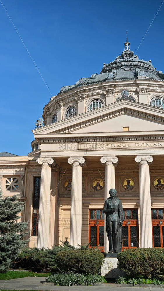 Bucharest, Romania – March 03, 2024: Aerial drone view of Carol I University Foundation. Main building with Carol I statue in front of it, roads and buildings Royalty Free Stock Video Footage