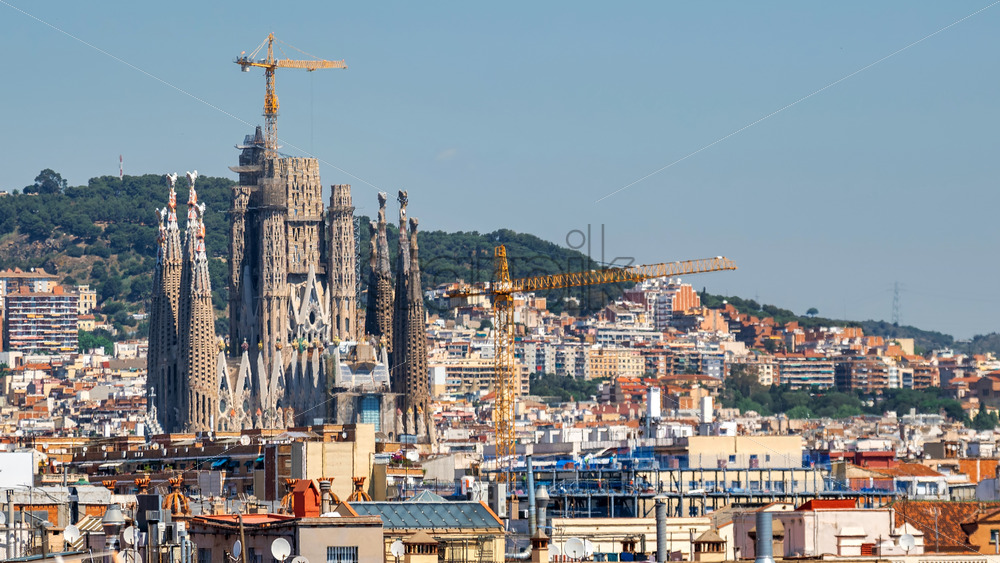 View of Barcelona, multiple buildings, The Sagrada Familia on the background in Barcelona, Spain