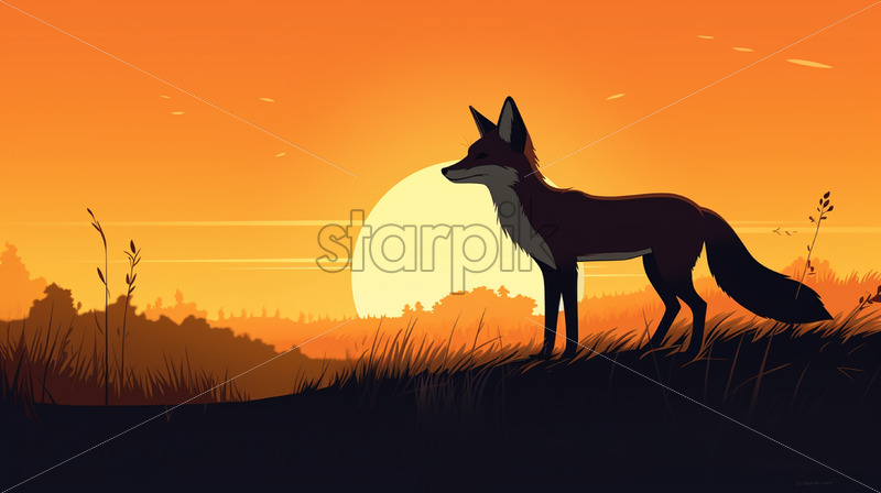The silhouette of a fox on a plain at sunset, created in 2d software