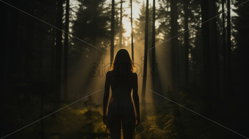 The silhouette of a girl on the background of a coniferous forest