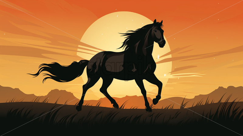 The silhouette of a horse on the background of a plain at sunset, illustration