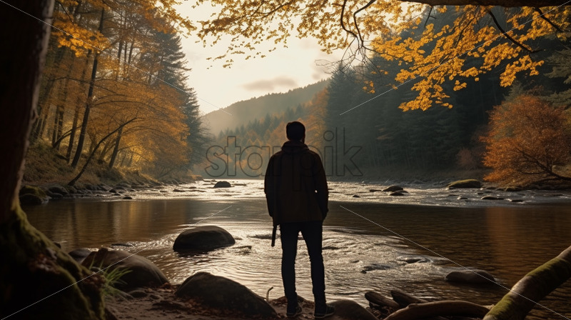 Home » Shop » Uncategorised » The silhouette of a man on the edge of a river in the forest