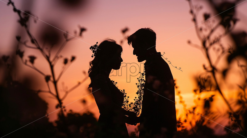 The silhouettes of a couple in love in a field with flowers