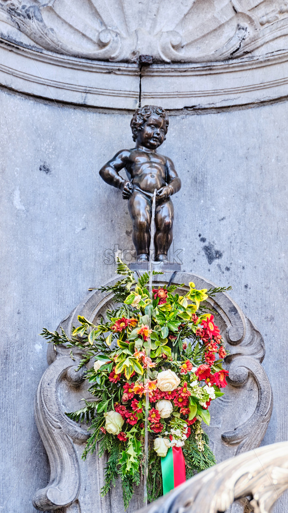 The statue of Manneken Pis from front view. Famous peeing boy in Brussels, Belgium