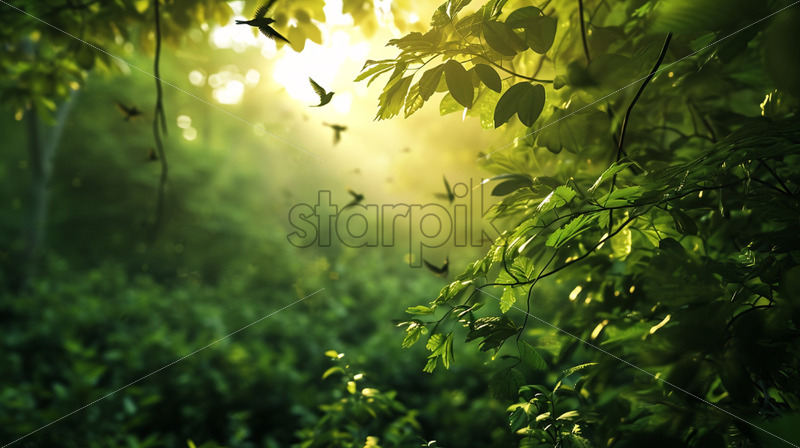 Group of colorful macaws engaged in vibrant midday chatter amid lush foliage